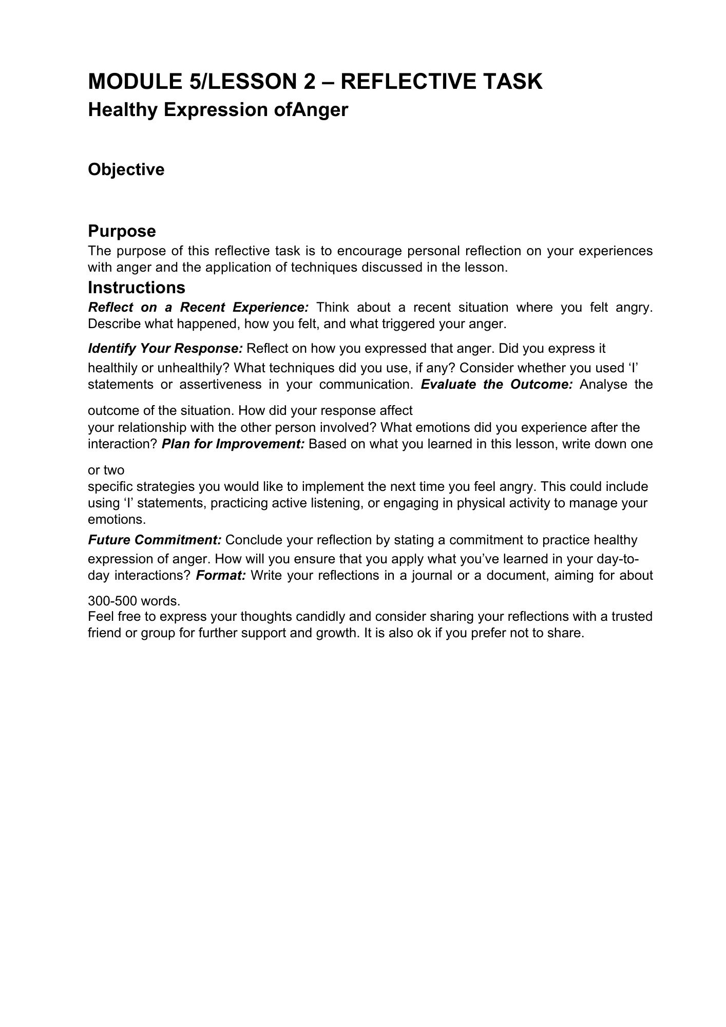 There will be a quiz at the end of this lesson to assess your understanding of the concepts introduced.  A reflection task is also included for this lesson to help you identify your understanding of the healthy expression of anger and effective communication around angry feelings.